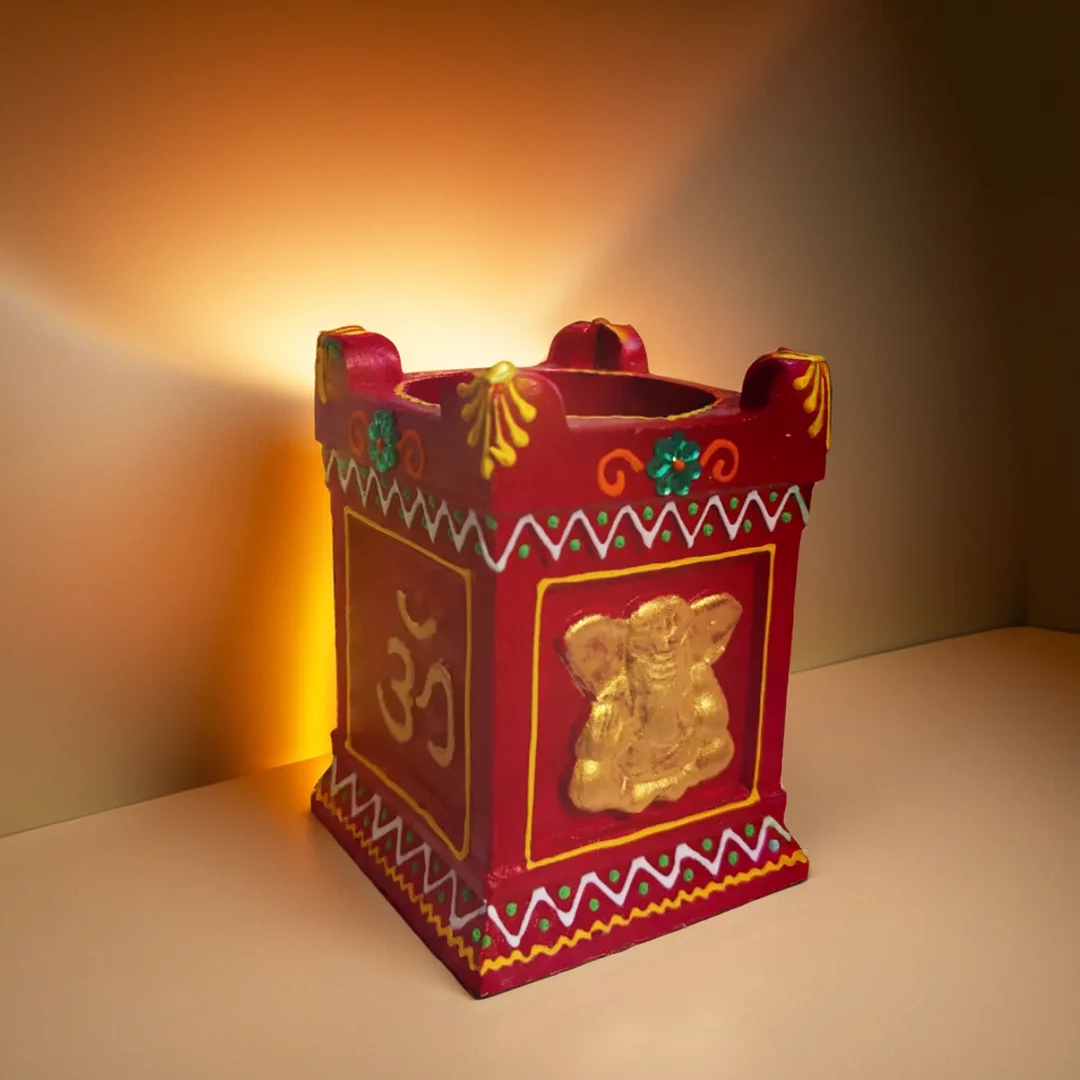 Introducing the Avrit, a cylindrical marvel designed to combine functionality with beauty. Featuring intricate carvings on its exterior, this piece not only shields the flame from the wind but also casts enchanting shadows on the ground, reminiscent of a captivating rangoli. Crafted to be both practical and ornamental, the Avrit adds an aura of elegance and sophistication to any space. Whether serving as the focal point of your festive decorations or as a standalone accent piece, its gentle glow imbues your surroundings with warmth and grace. Experience the enchantment of the Avrit as it illuminates your home, creating mesmerizing patterns of light and shadow that evoke joy and wonder in your celebrations.