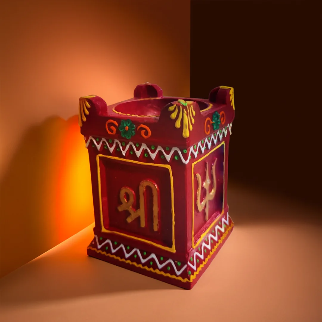 Introducing Tulasi Kyara, a vibrant crimson-colored diya featuring four faces adorned with sacred Hindu symbols. Perfect for Diwali and rituals, this eco-friendly diya blends spiritual significance with elegant craftsmanship. Illuminate your home with Tulasi Kyara, where tradition, symbolism, and sustainability meet in a stunning design.